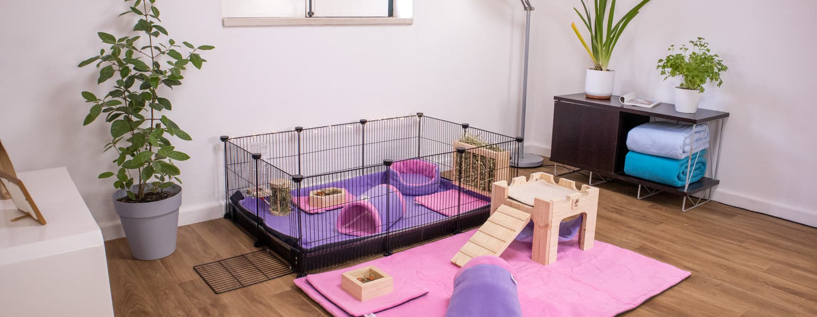 Guinea Pigs are herd animals that should not live alone. We recommend a space of at least 10.56 ft² / 0.98m² or a 2X4 Guineapet enclosure for up to three Guinea Pigs. Larger cages promote peaceful co-existence and room to exercise, thus preventing heart disease, diabetes, and bumblefoot. Let their personality shine through by offering the comfort they deserve.