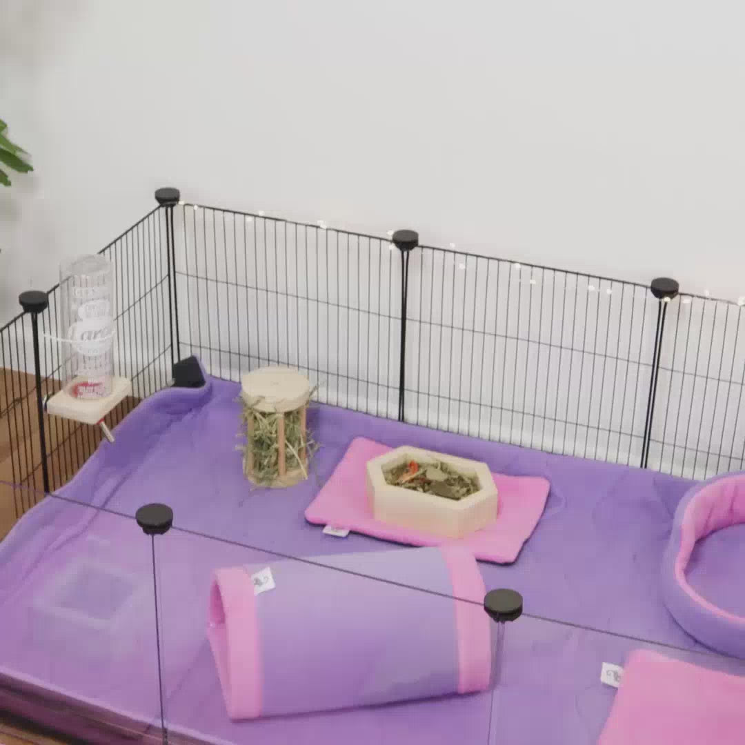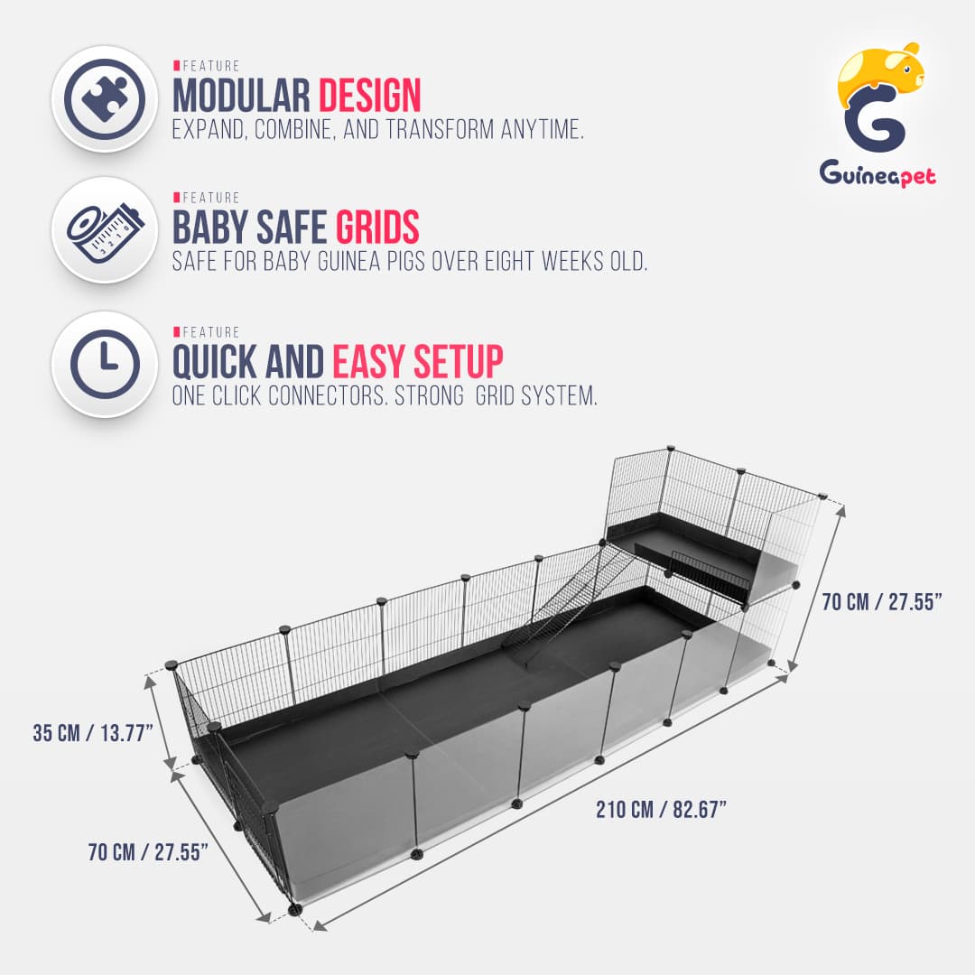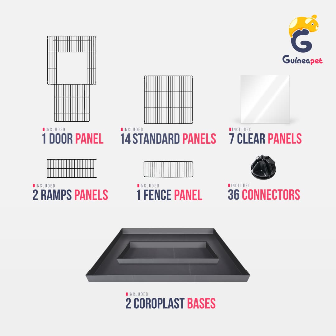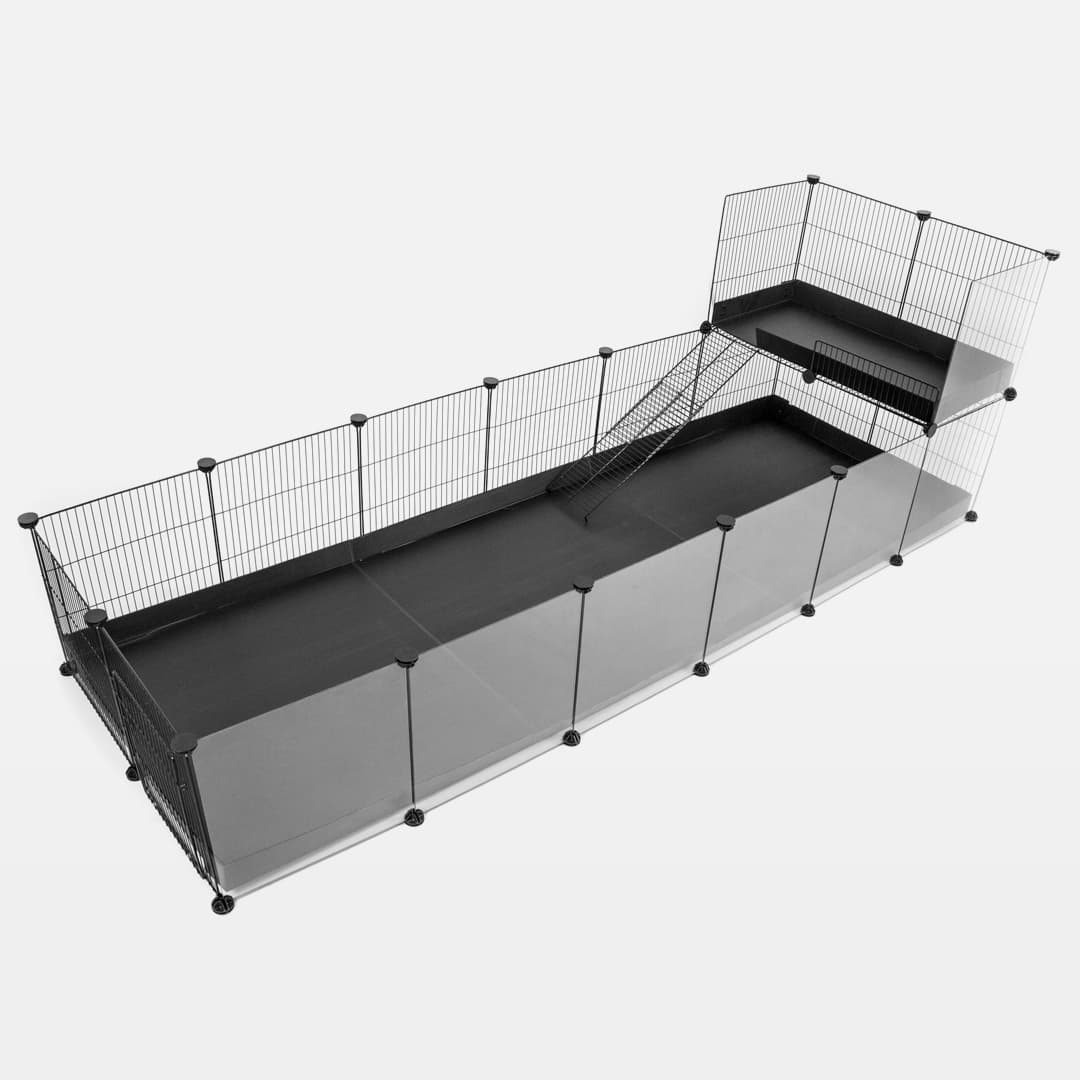Uma gaiola C&C melhorada com painéis frontais de plexiglass transparentes. Este modelo oferece uma visão clara da casa do seu amiguinho e tem uma aparência muito melhor. Fácil de montar, versátil, forte e durável. É uma solução modular perfeita para o alojamento de quatro porquinhos-da-índia ou outros animais de estimação pequenos. É recomendada a utilização de uma cobertura de rampa. Os painéis de última geração da